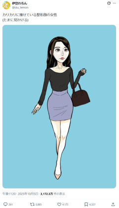 1: 2025/12/19(金) 14:04:38.70 カリカリに痩せている整形顔の女性(たまに見かける) pic.twitter.com/AuPdwRaBJz— 伊豆れもん (@izu_lemon) October 5, 2025 ※関連記事 【画像】絵師「カリカリに痩せてる整形顔の女性を描きました」 ???「ギョオオオオオオオオン」…