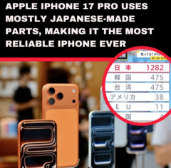 Appleが開発・発売するスマートフォンで、iPhoneシリーズの第19世代モデルである、iPhone 17。iPhone 17 ProとiPhone 17 Pro Max、新しい薄型のiPhone Airとともに、今年の9月19日に世界同時発売されました。心臓部のチップが「A19 Pro」に進化。前世代チップからCPU性能は最大40%向上し、ゲームやグラフィックス処理で圧倒的な性能向上を実現しています。また、これまではメインカメラだけが高画素でしたが、17 Proは「メイン・超広角・望遠」の3つ全てのレンズが、4800万画素となりました。そしてバッテリーも進化し、電池持ちが過去最高となり、新しい省エネ技術と大容量バッテリーのおかげで、ビデオ再生は最大33時間以上持つモデルもあります。革新的な冷却システムやAI機能なども加わり、史上最高のコストパフォーマンスとも言われますが、このiPhone 17に使われている日本製の部品は1282個で、全体の実に半分近くを占め、国別としては圧倒的な1位となりました。これは2位の韓国と台湾(475個)に3倍近い差をつける数字です。この件が海外のサイトでも取り上げられ、外国人から様々な反応が寄せられていました。その一部をご紹介しますので、ご覧ください。「日本人はお金があるなぁ…」 訪日外国人が気がついた世界的に特殊な日本のスマホ事情が話題に…