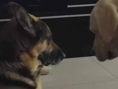 イヌの前足の間にオモチャが置いてあった。それで遊びたいなぁ → もう1匹はこうなります…