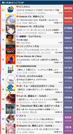 引用元: 618: Vtuberまとめ2025/12/21(日) 15:35:13.46 あっこりゃあああ 637: Vtuberまとめ2025/12/21(日) 15:35:45.73 >>618 botなかったらスバル以下やろなこの兎 646: Vtuberまとめ2025/12/21(日) 15:35:54.59 >>618 にじさんじは公式がそうやって儲けに来るからなぁ 670: Vtuberまとめ2025/12/21(日) 15:36:26.09 >>618 ホロライブもホロライブ公式をもっと稼働させてもいいのに 680: Vtuberまとめ2025/12/21(日) 15:36:43.06 >>618 え、ショック 689: Vtuberまとめ2025/12/21(日) 15:36:52.17 >>618 公式が強いコンテンツは駄目だろ ライバーとやらに主催させろよ 706: Vtuberまとめ2025/12/21(日) 15:37:14.25 >>618 むしろにじさんじって公式以外いらなくね? 707: Vtuberまとめ2025/12/21(日) 15:37:14.36 >>618 かっさん弱くね?w 716: Vtuberまとめ2025/12/21(日) 15:37:24.73 >>618 こんなことしてるから個人の同接上がんね~んだよw 724: Vtuberまとめ2025/12/21(日) 15:37:28.25 >>618 葛葉カップなのに葛葉が配信しないのかい 749: Vtuberまとめ2025/12/21(日) 15:38:05.03 >>724 運営が儲ける為の名義借りだから 811: Vtuberまとめ2025/12/21(日) 15:39:48.87 >>618 大規模大会出来るのがにじさんじのいいところだよな 当然代償に3桁の奴も大量にいるけど 813: Vtuberまとめ2025/12/21(日) 15:39:49.89 >>707 かっさんは痴漢界隈で騒動無い時はこんなもん 893: Vtuberまとめ2025/12/21(日) 15:41:52.65 >>618 みこち見切れてて草…