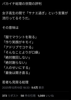 1 : 以下、?ちゃんねるからVIPがお送りします :2025/12/21(日) 09:33:41.223 ID:K8Zu6qyS0.net女子高生の間で「サナエ過ぎ」という言葉が流行ってるそうだ。その意味は「服でマウントを取る」「作り笑顔がキモイ」「アドリブでコケる」「そんなことよりが口癖」「絶対撤回しない」「絶対謝らない」「人のせいにする」「最後は開き直る」2 : 以下、?ちゃんねるからVIPがお送りします :2025/12/21(日) 09:34:15.881 ID:TDwQeAnP0.net流行ってないぞ転載元スレッド:…
