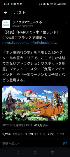 1: 2025/12/21(日) 06:42:25.61 なぜ日本にできないんだああああってブチ切れてて草 2: 2025/12/21(日) 06:42:32.42 当たり前やん 3: 2025/12/21(日) 06:42:42.15 ナルトはフランスで大人気やし 4: 2025/12/21(日) 06:42:50.55 そもそも日本人が話題にしないやん コミックセール開催中 『ONE PIECE』全巻40%ポイント還元! 『チェンソーマン』全巻48%ポイント還元! 『僕のヒーローアカデミア』全巻46%ポイント還元! 『呪術廻戦』全巻48%ポイント還元! 『鬼滅の刃』全巻48%ポイント還元! 『逃げ上手の若君』全巻48%ポイント還元! 『葬送のフリーレン』全巻48%ポイント還元! 『HUNTER×HUNTER』全巻48%ポイント還元! 『SPY×FAMILY』全巻48%ポイント還元! 『ワンパンマン』全巻44%ポイント還元! 『ダンダダン』全巻48%ポイント還元! 『ワールドトリガー』全巻48%ポイント還元! 『薬屋のひとりごと』16巻48%ポイント還元! 『黄泉のツガイ』11巻48%ポイント還元! 『探偵学園Q』全22巻が11円! 『ムダヅモ無き改革』5巻まで11円! 【セール】11円コミック 【セール】33円コミック 【セール】55円以下コミック 【保存版】31%以上還元 コミック おすすめ記事 6: 2025/12/21(日) 06:43:17.78 ユニバでええやん 10: 2025/12/21(日) 06:43:50.99 ナルトが海外人気高いのは知ってたけどテーマパーク出来るほど人気なんか 11: 2025/12/21(日) 06:44:14.25 ドラゴンボールもどっか中東よな 13: 2025/12/21(日) 06:44:22.65 >>11 サウジね 14: 2025/12/21(日) 06:44:25.93 日本じゃ単独で成立するほどの人気ないし… 19: 2025/12/21(日) 06:44:55.69 >>14 これ 今までNARUTO支持なんかしてこなかったエセファンのくせに海外に取られた時だけファンヅラするのキモすぎる 15: 2025/12/21(日) 06:44:27.61 草 21: 2025/12/21(日) 06:45:40.42 NARUTOは売上だけ見たら国内人気と海外人気どっこいどっこいやけどアニメもあるし フランスのドラゴボNARUTO人気はガチや 25: 2025/12/21(日) 06:46:10.25 日本でNARUTO単品はまあ無理やろ ジャンプの有名どころ一纏めとかならともかく 26: 2025/12/21(日) 06:46:16.50 日本でナルトテーマパーク出来てもそんなに賑やかになりそうもない 少年ジャンプテーマパークなら 31: 2025/12/21(日) 06:47:12.55 >>26 こっちのがええよな まあ今実質それをやってるのはユニバやけど 29: 2025/12/21(日) 06:46:28.78 日本じゃ精々ユニバで期間限定アトラクションにするのが関の山やろな 36: 2025/12/21(日) 06:48:23.44 フランスって観光客多いからな 38: 2025/12/21(日) 06:49:05.20 マイナーとまでは言わんが定期的な集客は絶対望めんよな 40: 2025/12/21(日) 06:50:03.77 なぜって人来ないからだろ 46: 2025/12/21(日) 06:51:44.33 どう考えてもドラゴンボールの方が日本なら先なんだよな 82: 2025/12/21(日) 06:59:45.48 NARUTOってドラゴボみたいに人気ソシャゲもないから自分から見ようってなる子供以外まじで触れる機会ないんだよな 86: 2025/12/21(日) 07:00:06.95 とある南米の国に行った時NARUTOのキャラの刺青入れてる人いたわ どんだけ人気やねん 74: 2025/12/21(日) 06:57:14.86 欧州やとほんま人気よな 73: 2025/12/21(日) 06:57:11.82 日本に作ってもそんなにウケない 98: 2025/12/21(日) 07:02:20.15 ナルトは面白いしよく出来てると思うけど、テーマパーク行くほどの熱量はないな ラーメン屋は気になるけど 89: 2025/12/21(日) 07:01:02.66 土地がねえだろ 79: 2025/12/21(日) 06:59:02.54 土地と建設費どうすんの 日本でなんて無理やろ 72: 2025/12/21(日) 06:57:01.11 今NARUTOにどこまで集客力あるんやろって思ったけど流石に完結しとるからこういうのに名前入らんか ないよな? 102: 2025/12/21(日) 07:03:17.06 >>72 こうしてみるとドラゴボて年齢若いな 40年前の漫画なのに推しの子呪術あたりと平均年齢変わらんのか ガンダムも43歳なら46年目としては結構若いな 379: 2025/12/21(日) 08:24:00.84 >>72 思ったより男性100みたいなコンテンツってないんだな 女性側は割とあるのに 81: 2025/12/21(日) 06:59:21.45 忍者が人気なんやろ 侍も人気やろうしるろうに剣心テーマパークも作ればええ 109: 2025/12/21(日) 07:04:12.64 女さん来ないテーマパークなんて日本では価値ないよ 115: 2025/12/21(日) 07:05:47.94 鬼滅ランド作ろうや 117: 2025/12/21(日) 07:05:55.58 ぶっちゃけ日本にはジャンプ単体のテーマパークは日本層が殆んどの鬼滅でやっとてくらいやろ ワンピドラゴボナルトあたりは単体で展開するなら海外のほうが集客力高い 141: 2025/12/21(日) 07:09:39.54 別に後追いでええからやればええと思うけどな 観光客にフランスのナルトと日本のナルトどっちに行きたいかなんて答えでとるようなもんやろ 135: 2025/12/21(日) 07:08:45.69 テーマパークの1エリアならいけてもナルト単品でテーマパークはさすがに採算とれんやろ 156: 2025/12/21(日) 07:11:54.93 やるとしたらジャンプパークでやったほうがいい そちらなら集客見込めそうだし 164: 2025/12/21(日) 07:14:01.22 任天堂すら失敗するリスク恐れてUSJ借りてるし 197: 2025/12/21(日) 07:21:10.98 そもそも日本は島国って事忘れてるよな 円安効果なかったら日本旅行なんて一生に一度位やろ フランスはヨーロッパの連中が県跨ぐ感じで来てくれる…