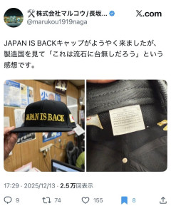 【悲報】高市支持者さん、高市首相の「JAPAN IS BACK」帽子を購入した結果、中国製だと知り絶望