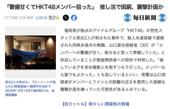 1 : 翌日も行き「今日こそ殺すぞ」と思ったがスタッフに「何してるんですか?」と呼び止められたので刺した。逃げる際に近くにいた女性もついでに刺した 2 : 「警備甘くてHKT48メンバー狙った」 推し活で困窮、襲撃計画か(毎日新聞) - Yahoo!ニュース HKT48の劇場が入る福岡市中央区の商業施設や、隣接する「みずほペイペイドーム福岡」の下見をしていたとされる山口容疑者は12月に入り、包丁3本や催涙スプレーを購入。事件前日の13日、襲撃を実行するつもりでドーム1階の関係者駐車場に入ったという。駐車場はメンバーが交流サイト(SNS)用の写真を撮影するなど活動拠点の一つだったが、部外者を完全に排除するような警備はなされておらず、この日も山口容疑者はメンバーの目の前にまで近付いたとされる。だが襲撃は実行されず、「誰を殺すか考えているうちに、メンバーが通り過ぎてしまった」と供述しているという。全文はソースで 3 : アホで良かった…