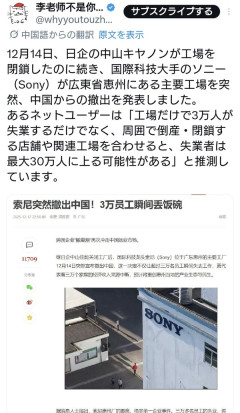 SONYが中国の工場を閉鎖。失業者30万人規模か
