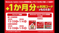 1: 2025/12/22(月) 08:15:11.67 ID:fHATKVTI0 期間中に、ローソン・ナチュラルローソン・ローソンストア100にてNintendo Switch Online利用券(12ヶ月券)をご購入後、専用ウェブサイトからご応募いただくと、もれなくNintendo Switch Online 1カ月(30日間)利用コードをプレゼント!…