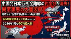 1: 名無し 2025/12/22(月) 22:15:33.45 ID:cnPRs9x10 中国の経済メディア「第一財経」は22日、同日から1月初旬までの2週間で、中国発日本行きの90路線のうち46路線で全便がキャンセルされたと報じた。高市早苗首相の台湾有事に関する答弁を受け、中国政府が11月に行った日本への渡航自粛呼びかけの影響とみられる。 キャンセルは成都、武漢、重慶と大阪を結ぶ路線や地方都市間が中心で、東京―北京などの大都市間は含まれていない。また、2026年1月の日本行きの便も既に約4割がキャンセルされているという。 朝日新聞デジタル ■要約 ・中国発日本行きの全路線の約半分にあたる46路線が、年初まで全便キャンセルとなった。 ・高市首相の台湾有事答弁に対する中国側の対抗措置「渡航自粛」の余波とされる。 ・地方路線が狙い撃ちされる一方、主要都市(東京・上海等)の路線は維持されている。 ・2026年1月分も既に2195便(全体の40.4%)がキャンセルされる異常事態となっている。 ■解説 中国側がインバウンド(観光客)を人質に取った「経済的威圧」を本格化させてきた形だ。高市首相の「存立危機事態」答弁という日本の主権に関わる正当な発言に対し、なりふり構わぬ報復措置で日本の地方経済を揺さぶろうとする意図が透けて見える。 しかし、こうしたあからさまな圧力は、むしろ日本国内における「脱中国依存」の機運を加速させるだけだろう。特定の国からの観光客数に依存しすぎることの危うさが改めて浮き彫りになったと言える。 主要都市の路線を残しつつ地方便を止めるやり方は、日本の世論を分断させようとする姑息な手段だが、高政権には毅然とした態度を貫いてほしい。短期的な観光利益のために国家の安全保障を譲歩すれば、それこそ中国の思うツボだ。今こそインバウンドの多角化を進め、中国の身勝手な振る舞いに左右されない経済基盤を構築すべき局面にある。 【!】中国人女性、なぜか羽田空港で台湾人旅行者に「台湾は中国のものだ!」と大声で怒鳴り政治的主張 と暴言で怒り狂う動画が大拡散される → www... 【速報】 YouTuberヒカル、ようやく気づくwwwwwwwwwwww 【動画あり】エマ・ワトソンを ”絶対に女を●●せる椅子” に座らせたらこうなるwwwww…