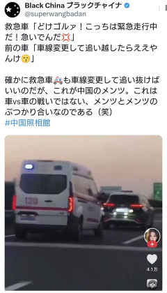 中国の救急車「前の車どけ!こっちは緊急走行中だ」 →前の車「道を譲るのは気に入らない」