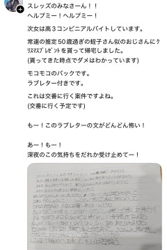 1: 名無しさん@ 2025/12/24(水) 13:24:40.71 ID:GsWUIomB0EVE 3: 名無しさん@ 2025/12/24(水) 13:27:23.44 ID:kg1eArA+0EVE >>1 一々晒さず交番行けばええやん 37: 名無しさん@ 2025/12/24(水) 13:41:06.85 ID:9UlBULR60EVE >>1 内容もナチュラルに自分に甘いところが ガチのおぢっぽい 年の差は関係ない 私にほうこくして LINEか電話で返事して、もしくは店頭で 94: 名無しさん@ 2025/12/24(水) 14:00:53.67 ID:br0ERzVE0EVE >>1 人の告白を笑うなよ そういうのの積み重ねが少子化に繋がってるんやで 2: 名無しさん@ 2025/12/24(水) 13:26:25.99 ID:rE9biqpF0EVE 男の文字っぽくないなこれ 4: 名無しさん@ 2025/12/24(水) 13:27:41.96 ID:qI8gpdjg0EVE なんだこの字 6: 名無しさん@ 2025/12/24(水) 13:28:15.56 ID:BVeffdLR0EVE 警察行ってもいいけどすぐには動きようがなさそう 8: 名無しさん@ 2025/12/24(水) 13:28:48.28 ID:2vsTDAYo0EVE 嘘松だぞ 9: 名無しさん@ 2025/12/24(水) 13:29:14.55 ID:TLahi8nh0EVE ラブレター渡しただけで警察は世知辛い世の中やね 11: 名無しさん@ 2025/12/24(水) 13:29:35.88 ID:8+pPL7rl0EVE 好きになったら悪いんか 15: 名無しさん@ 2025/12/24(水) 13:30:45.69 ID:cp5FWbJx0EVE どんどん興奮してきてるやん こわい 170: 名無しさん@ 2025/12/24(水) 14:46:54.32 ID:SEjMK5WW0EVE >>15 これw 21: 名無しさん@ 2025/12/24(水) 13:34:55.74 ID:DupYDkmP0EVE 興奮して字がだんだん大きくなっていくの草 35: 名無しさん@ 2025/12/24(水) 13:39:03.57 ID:OmXLTgR90EVE スレッズとかいう魔境 40: 名無しさん@ 2025/12/24(水) 13:42:28.22 ID:Yvrv14ZU0EVE なんでだんだん文字でかくなるねん 大昔のテキストサイトかな 42: 名無しさん@ 2025/12/24(水) 13:43:37.67 ID:thTtW5/I0EVE そういや何か不具合でブログの文字が段々デカくなるやつあったな 最後の方は画面に1文字しか入っとらんやつ 51: 名無しさん@ 2025/12/24(水) 13:45:49.47 ID:thTtW5/I0EVE >>42 あったこれや 62: 名無しさん@ 2025/12/24(水) 13:48:54.81 ID:bjLEo9YE0EVE 最初は丁寧に書いたんやろうけど途中から読めんわ😲 71: 名無しさん@ 2025/12/24(水) 13:54:52.61 ID:soLhHwuj0EVE 好きになったら歳の差なんてって言っていいのはJK側やで 176: 名無しさん@ 2025/12/24(水) 14:49:46.76 ID:SEjMK5WW0EVE >>71 確かにw 109: 名無しさん@ 2025/12/24(水) 14:04:59.04 ID:jTZ0NZtG0EVE 本当ならこわすぎるな 135: 名無しさん@ 2025/12/24(水) 14:20:45.49 ID:YT3DmC1wdEVE どんどん文字がデカくなっていくのがヤバさを表している 167: 名無しさん@ 2025/12/24(水) 14:42:32.30 ID:pQuxgRe70EVE 50前後にもなってこの字の汚さ 引用元…