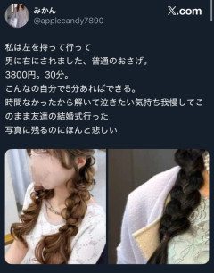 1: 2025/12/24(水) 16:43:45.71 私は左を持って行って男に右にされました、普通のおさげ。3800円。30分。こんなの自分で5分あればできる。時間なかったから解いて泣きたい気持ち我慢してこのまま友達の結婚式行った写真に残るのにほんと悲しい pic.twitter.com/4lj3hjW6Jf— みかん (@applecandy7890) December 22, 2025 可哀想や…😭 ※関連記事 【画像】この漫画の「ダメ人間」と付き合っている彼女の話、少し怖くて草wwwww…
