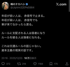 Xの頭おかしい人「年収が高い人は信号を無視する。ルールを破る人は強者になれる。」