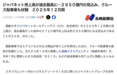 1 : 通販大手ジャパネットホールディングス(HD、佐世保市)の2025年12月期の売上高が、過去最高だった前年の2725億円を上回る約2950億円になる見込みであることが22日、分かった。 通販事業ではエアコンなどの主力商品が売り上げを伸ばしたほか、クルーズ船事業も販売が好調だった。また24年10月に開業した長崎スタジアムシティ(長崎市幸町)や、今年1月に開局したBS放送局「BS10」などの放送事業も売り上げに貢献したとみられる。 スタジアムシティ内のハピネスアリーナで19日に開いたジャパネットグループの忘年会で社員や取引先など計約1600人を前に同HDの髙田旭人社長が明らかにした。事業の柱である通販事業以外でもクルーズ船事業やウオーターサーバー事業は「収益の柱になりつつある」と手応えを語った。 全文はソースで 5 : 老人が一日中テレビショッピング観てて買い物するからな…
