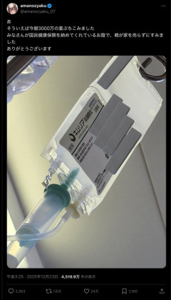 1: 2025/12/24(水) 20:19:46.08 どう思う?いいだろ!! あそういえば今朝3000万の薬ぶちこみましたみなさんが国民健康保険を納めてくれているお陰で、親が家を売らずにすみましたありがとうございます pic.twitter.com/kAQjgN28lZ— amanozyaku (@amanozyaku_07) December 23, 2025 ※関連記事 【衝撃】うつ病の薬、男性の下半身をめちゃくちゃにしてしまう……