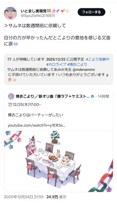 引用元: 110: Vtuberまとめ2025/12/25(木) 12:16:30.48 こより言われてんぞ 135: Vtuberまとめ2025/12/25(木) 12:16:59.24 >>110 こよりらしいな 216: Vtuberまとめ2025/12/25(木) 12:19:16.65 >>110 あっ 292: Vtuberまとめ2025/12/25(木) 12:21:32.64 >>110 いつに依頼したかなんてどうでもいいわ 294: Vtuberまとめ2025/12/25(木) 12:21:36.73 >>110 またこよりキレそう 317: Vtuberまとめ2025/12/25(木) 12:22:11.06 >>110 ( ・᷄ᯅ・᷅ )草 320: Vtuberまとめ2025/12/25(木) 12:22:19.18 >>110 うーんこのプライド 333: Vtuberまとめ2025/12/25(木) 12:22:41.71 >>110 草 343: Vtuberまとめ2025/12/25(木) 12:23:05.35 >>110 たしかにわざわざ数週間前になんて言う必要性を感じないからな 355: Vtuberまとめ2025/12/25(木) 12:23:31.50 >>110 嫌いじゃないよこよりのこういうところ 358: Vtuberまとめ2025/12/25(木) 12:23:34.35 >>110 実現党って吊られたんじゃなかったのか? 366: Vtuberまとめ2025/12/25(木) 12:23:54.34 >>110 サムネは○○に手掛けて貰ったでいいわな 普通は 377: Vtuberまとめ2025/12/25(木) 12:24:17.82 >>110 ギャハハハハwwwwwwwwwwwwwwwwww 408: Vtuberまとめ2025/12/25(木) 12:25:08.28 >>110 こよりらしいわw 421: Vtuberまとめ2025/12/25(木) 12:25:36.89 >>110 くぉんの・・・ 824: Vtuberまとめ2025/12/25(木) 12:38:10.19 >>110 やっぱあいつがスティールか…