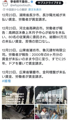 1:2025/12/25(木) 17:45:42.02 ID:DaNNoxax012月23日,湖南省长沙市,长沙阳光城欠薪,工人讨薪。12月23日,河北省高碑店市。工人反映:高碑店沐春上禾月子中心欠工资,我们受八十名员工委托,共计欠薪八十万,投诉无门。12月23日,山东省潍坊市,鲁元建材有限公司。工人反映:2000年的八个月工资被拖欠至今,已经25年了,堵门讨薪。… pic.twitter.com/g50hbVCxwx— 李老师不是你老师 (@whyyoutouzhele) December 24, 2025転載元スレッド:…