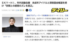 1 : SKY-HI、年内活動自粛 未成年アイドルと深夜面会報道を受け「世間との感覚のズレを是正」(デイリースポーツ) - Yahoo!ニュース 音楽プロデューサーで実業家のSKY-HIこと、日高光啓が25日、公式サイトで年内の活動を自粛することを発表した。SKY-HIは一部報道で、未成年の女性アイドルと深夜に面会したと報じられ謝罪していた。 SKY-HIは公式サイトで事務所の今後の方針などを公表。今回の報道について、弁護士ら専門家の指示を仰ぎ内部調査をしたとし「違法行為に該当する事実は確認されなかった旨の報告を受けております」と説明。全文はソースで 2 : ただの年末年始休みやな 3 : 謹慎短すぎて草…