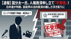 1: 名無し 2025/12/25(木) 22:55:42.18 ID:oK4x9Zt10 日本テレビの番組を「コンプライアンス上の問題行為」を理由に降板となった元「TOKIO」の国分太一さんが日弁連に申し立てていた人権救済について、日弁連が「取り扱うことができない」と判断していたことが25日分かった。 共同通信 ■要約 ・国分太一氏が日弁連へ申し立てていた人権救済が、不受理となったことが判明した。 ・国分氏は「コンプライアンス上の問題」を理由に日本テレビの番組を降板していた。 ・日弁連側は、この事案について「取り扱うことができない」との判断を下した。 ・芸能人の降板劇を巡る法的・人権的な救済の難しさが浮き彫りになった。 ■解説 「コンプライアンス」という便利な言葉一つで、詳細な説明もなくタレントを排除するメディア側の姿勢には、以前から不透明さが指摘されてきました。しかし、リベラルなスタンスで知られる日弁連が「取り扱い不可」とした事実は、この問題が単なる人権侵害の枠組みでは捉えきれない、民間企業内の契約や広義の自主規制の範囲内にあると判断された可能性を示唆しています。 高市政権下で「法の支配」や「公正なルール」の重要性が叫ばれる中、公共の電波を扱うテレビ局が独自の解釈で「コンプライアンス」を運用し、司法や救済機関も踏み込めないブラックボックスを作っている現状は、健全とは言えません。もし真に問題行為があったのであれば、憶測を呼ぶような曖昧な表現ではなく、国民が納得できる基準を示すべきでしょう。 一方で、申し立てが退けられた以上、法的な「人権救済」という手段にも限界があることが露呈しました。今後は、放送法や契約の在り方そのものを、より透明性の高いものへと是正していく議論が必要になるかもしれません。 「日本の新幹線」を売らずによかった…「貸した金が返ってこない」インドネシア新幹線の泥沼 1回目に中に出されて、もうダメだと思った。相手のお子さん3人もすぐ出来たからアフター※※使った方がいいって言ってた。その時はどうでも良くて... 高市早苗「原潜導入」マスコミ「オフレコ報道!(核保有発言」日本「核弾頭は数か月で運用可能(実質核保有国」中国「IAEA査察強化しろ!(中国の核管理体制は不透明」→…